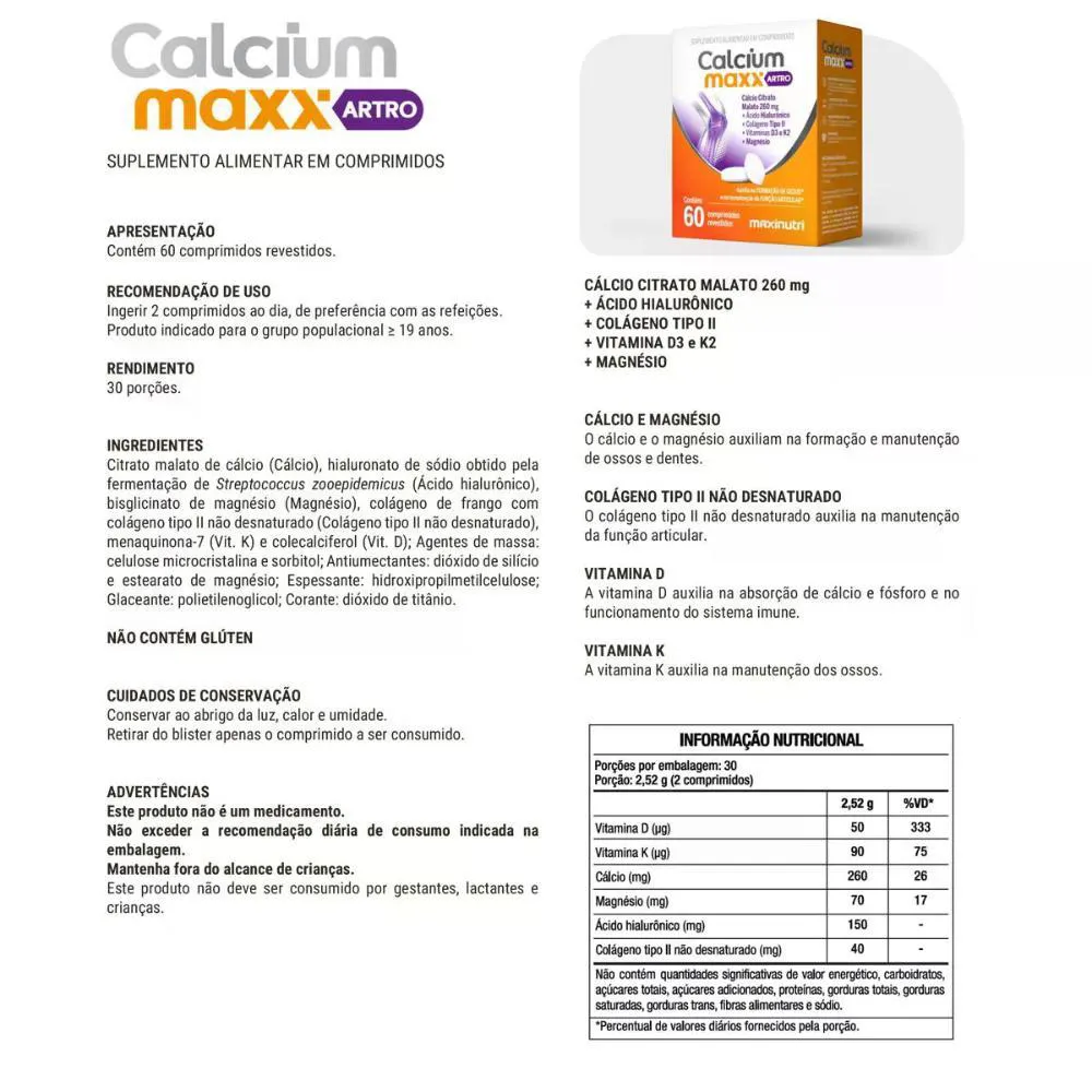 Citrato malato de cálcio (Cálcio), hialuronato de sódio obtido pela fermentação de Streptococcus zooepidemicus (Ácido hialurônico), bisglicinato de magnésio (Magnésio), colágeno de frango com colágeno tipo II não desnaturado (Colágeno tipo II não desnaturado), menaquinona-7 (Vit. K) e colecalciferol (Vit. D); Agentes de massa: celulose microcristalina e sorbitol; Antiumectantes: dióxido de silício e estearato de magnésio; Espessante: hidroxipropilmetilcelulose; Glaceante: polietilenoglicol; Corante: dióxido de titânio.