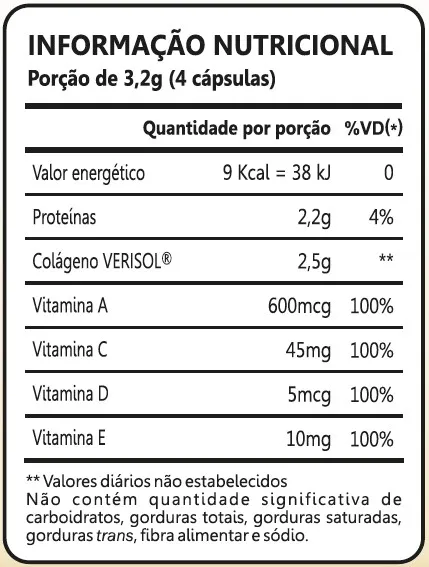 Peptídeos bioativos de colágeno hidrolisado com peso molecular médio de 2kDa (Verisol®), ácido ascórbico (Vit. C), acetato de DL-alfa-tocoferol (Vit. E), acetato de retinol (Vit. A), selenito de sódio (Selênio) e colecalciferol (Vit. D3); Antiumectante: silicato de magnésio hidratado (Talco); Cápsula: Gelificante: gelatina; Corante: dióxido de titânio.