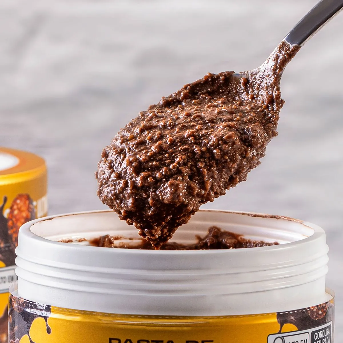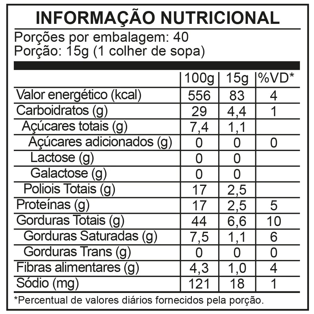 Ingredientes: Amendoim torrado, creme de avelã e cacau (maltitol, óleo vegetal, soro de leite em pó, pasta de avelã, cacau em pó, leite em pó integral, gordura vegetal, avelã triturado, estabilizantes poliglicerol polirricinoleato, aromatizante e edulcorante sucralose), proteína concentrada do soro do leite, cacau em pó, sal, aromatizante, edulcorantes xilitol, sucralose e acessulfame de potássio e enzima lactase.